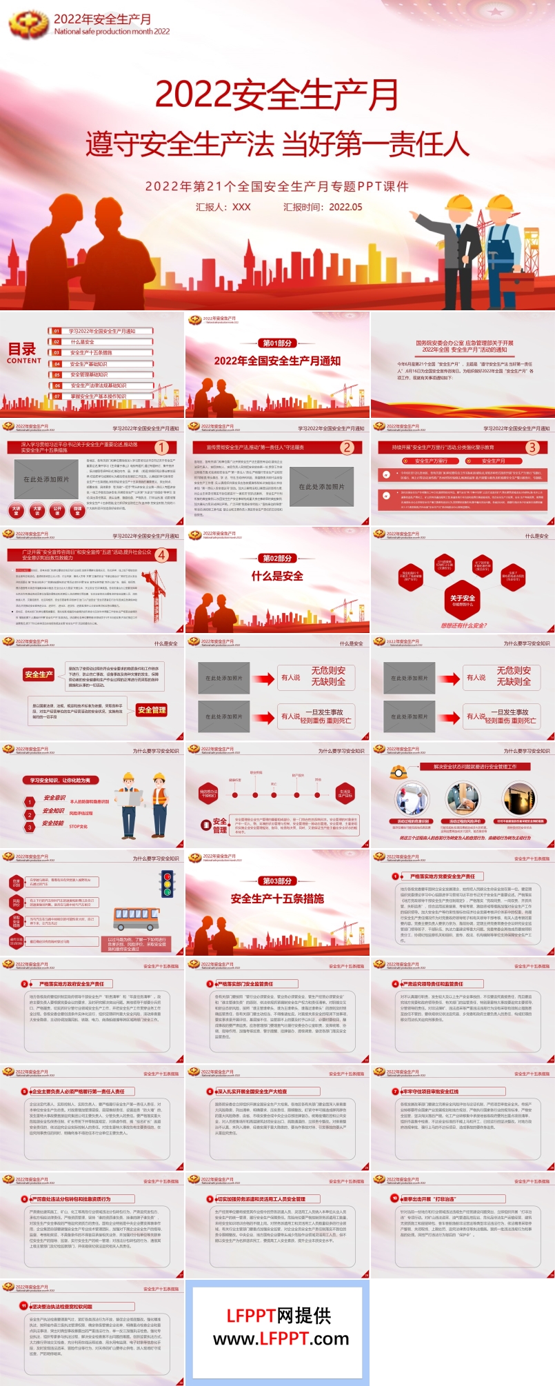 • 这个ppt主要是关于2022年安全生产月遵守安全生产法当好第一责任人的内容。随着我国经济社会的不断发展,各行各业都会有着各种各样的生产活动,因此国务院安委会办公室应急管理部就开展了2022年全国安全生产月的活动,6月16日为全国安全宣传咨询日,主题就是遵守安全生产法当好第一责任人。以此期望各大中小企业及社会组织都能遵守国家相关法律规定,安全生产。