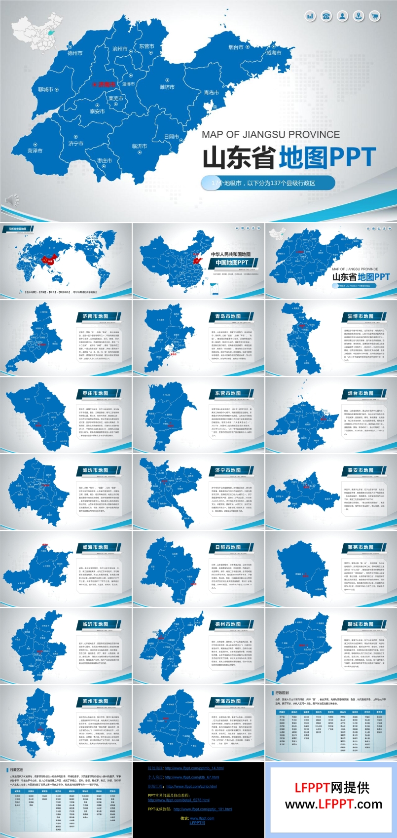 • 这套山东省地图PPT模板非常详细的将山东省分为17个地级市,并分别将这些地级市中的县级市逐一展示出来。详细的介绍了每一个地方的地理位置、当地人文风情、历史文化,当地特色经济产业。