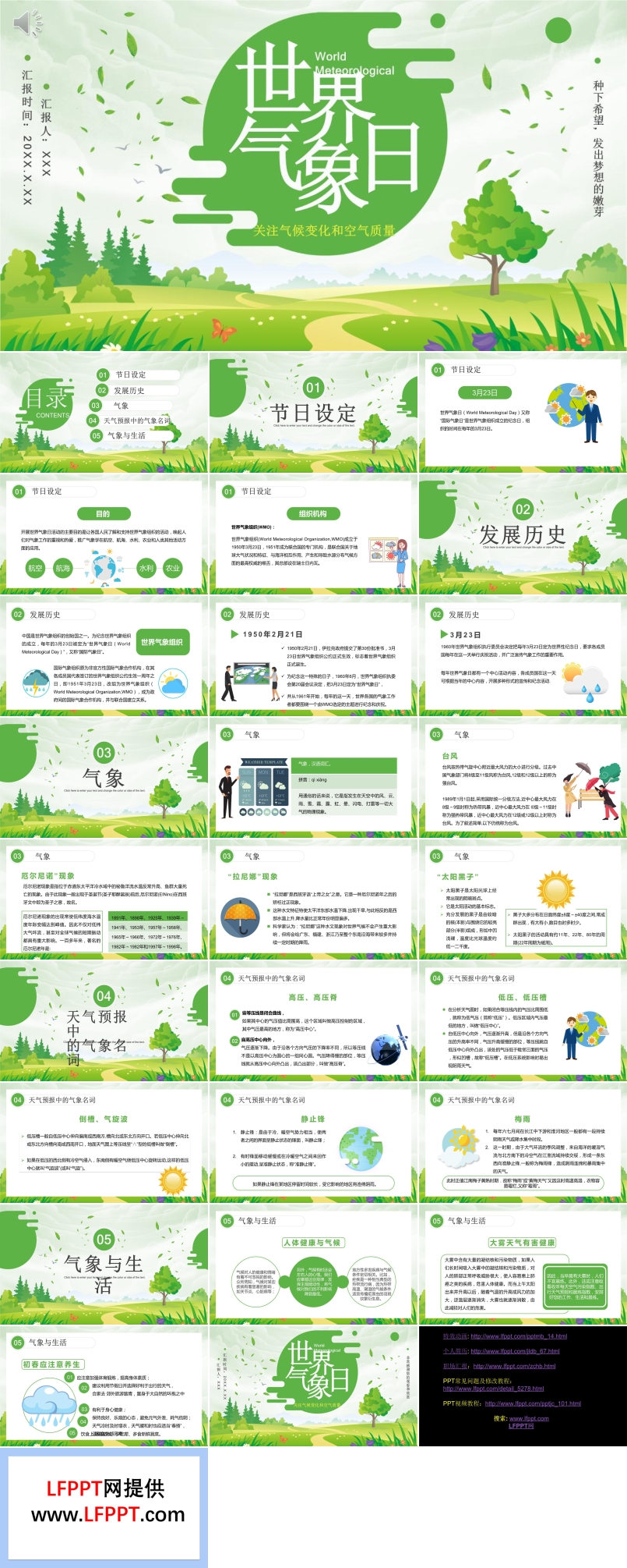 • 这是一套世界气象日PPT模板,共计29页。气候作为因地球上的海洋、大气相互作用衍生的物理名词,具体在人类生活中可以解释为每天的天气现象,故气候对生活的重要性也是不言而喻的。但是由于人类对地球资源的过度开采,导致环境急剧恶化,诸多动物走向濒临灭绝的地步,大气层的活动也因此受到了严重的干扰,令地球上的气候环境日剧恶劣。