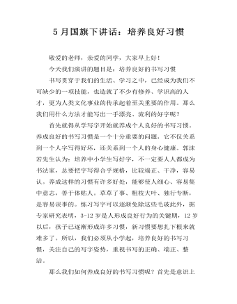 各位老师,各位同学:大家早上好!刚才,我们都经历了一个庄严而神圣的时刻:伴随着初升的朝阳,五星红旗在雄壮嘹亮的国歌声中冉冉升起,猎猎飘扬。是的,这就是我们的国旗,象征着浴血奋战中的力量和勇气,象征着外交活动时的形象与尊严,象征着和平年代的理智与激情。每一次五星红旗的升起,都会在中国人的心灵深处升腾起一股热浪,这是一份自豪和中国人的尊严,是一股油然而生充满力量的爱国情怀。当奥运会领奖台上的五星红旗伴随着国歌声一次次升起的时候,全世界的炎黄子孙都为之欢呼雀跃;当登山健儿把五星红旗插上世界顶峰——珠穆朗玛峰时,全世界的华人都为之骄傲;当嵌着五星红旗的人造卫星和“神舟”号宇宙飞船升入太空的时候,中国让世界各国刮目相看;当中国综合国力日渐强大的时候,全世界把目光投向了中国——站在国旗下,我为祖国骄傲。这份炽热燃烧、薪火相传的民族情怀是庄严和神圣的,却也是平凡和普通的。我们每周一次的升旗仪式上,在雄壮的国歌声中,队员们都庄严的敬着少先队队礼,神情专注,这也无疑是一种爱国的表现。曾经,抛头颅、洒热血是烈士们表达对祖国热爱的方式。而生活在今天和平年代的我们如何表达对祖国的热爱呢?那就是先从佩戴好红领巾开始。